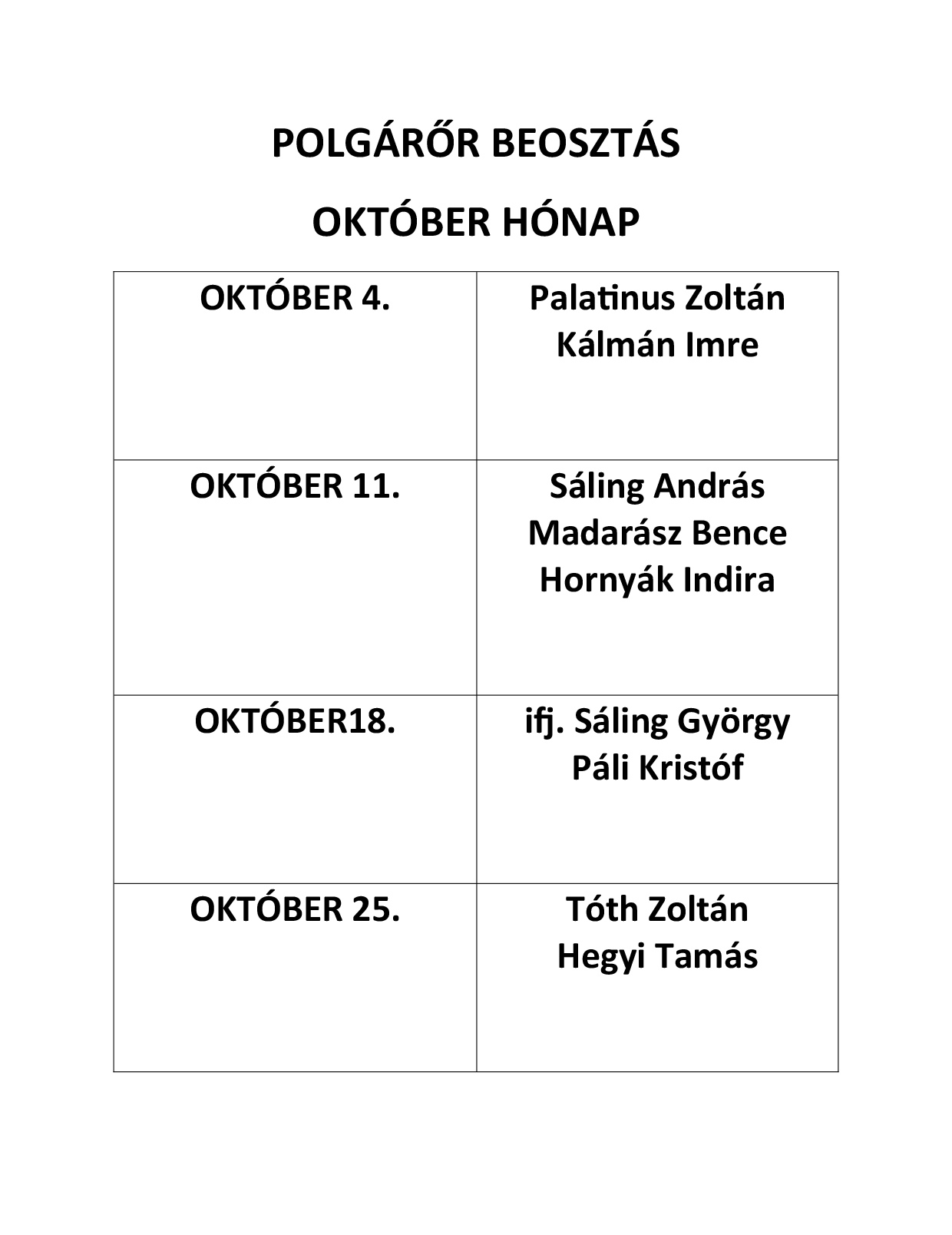 A polgárőrség együttműködve a rendőrséggel a falu biztonságáért tesz meg mindent. Hetente 2-3 fő szolgálatot teljesít. Ilyenkor akár gyalogosan, kerékpárral vagy polgárőr autóval járjuk a község utcáit. A kiírt polgárőr párok névsora megtekinthető a falu honlapján, és kifüggesztve a Kultúrház ajtaján.