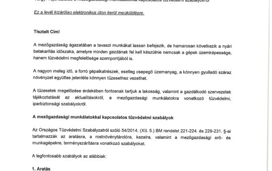 Tájékoztatás a mezőgazdasági munkálatokkal kapcsolatos tűzvédelmi szabályokról