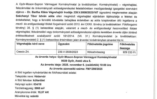 Árverési hirdetmény Hédervár 034-18 hrsz.